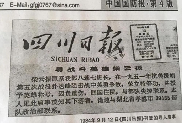 寻人启事上说,邓公要在全国范围内寻找一个叫“柴云振”的抗美援朝特等功臣。他曾经在志愿军15军45师3营8连当班长,曾在朴达峰阻击战中受伤,特征是右手食指断掉了一截。